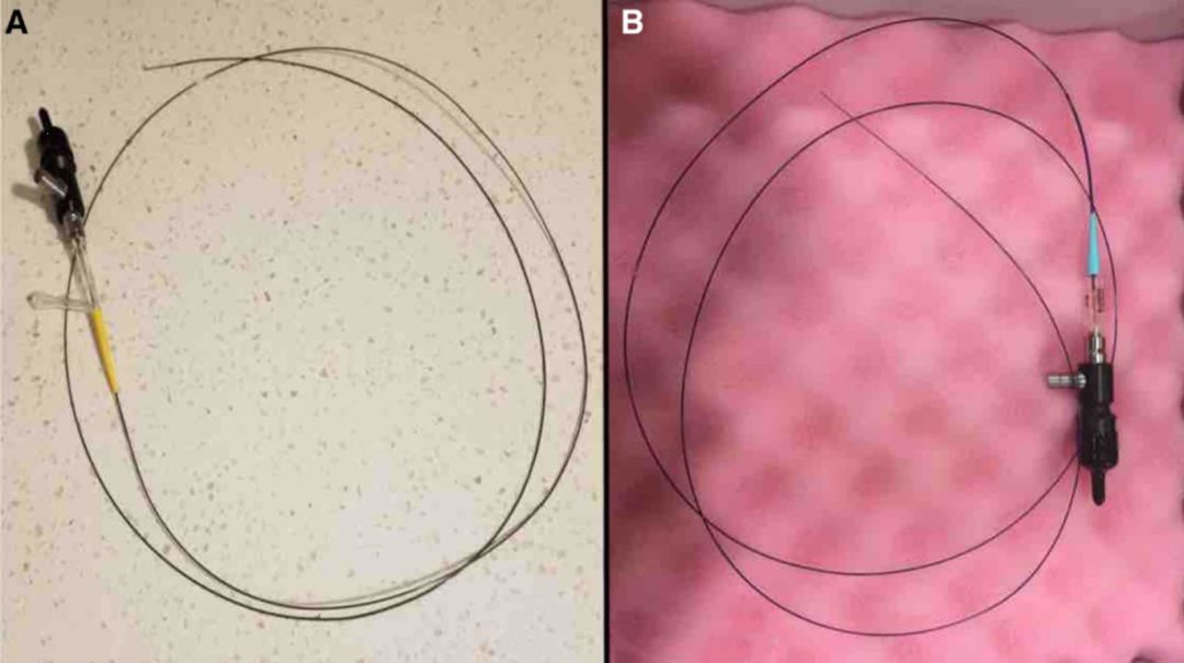 图2. 在SL-10微导管中嵌入显微血管内镜(A),在Scepter C双腔气囊微导管中嵌入显微血管内镜(B)。