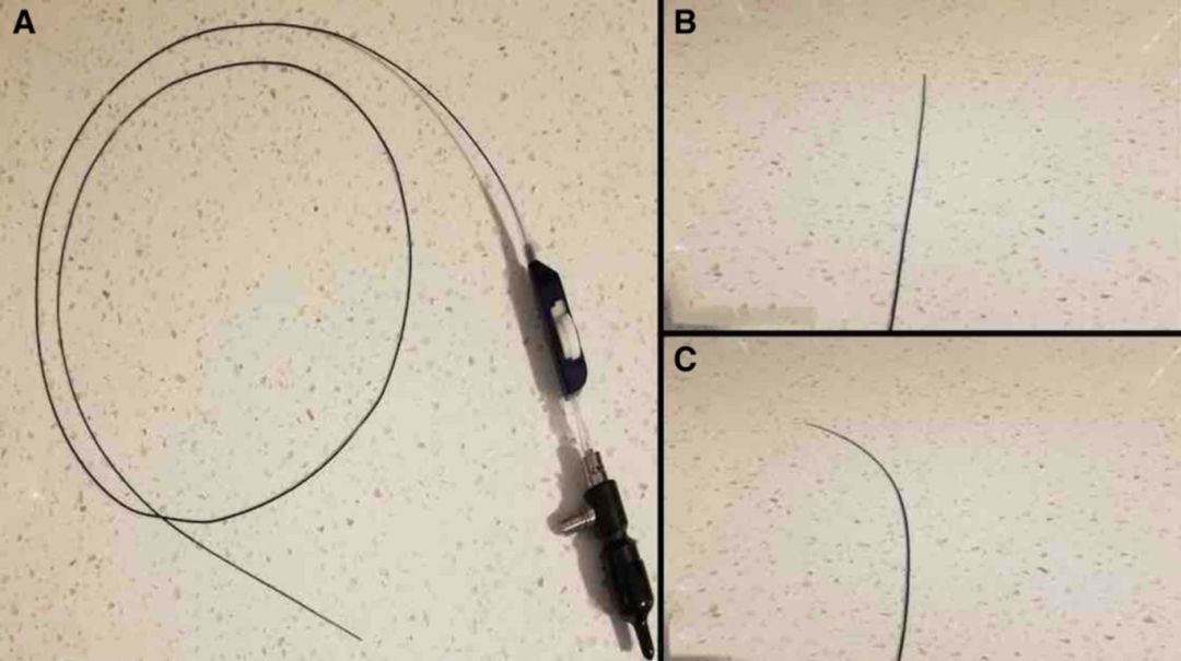 图3. 在Swift Ninja微导管中嵌入显微血管内镜(A),中立位(B),最大弯曲位(C)。