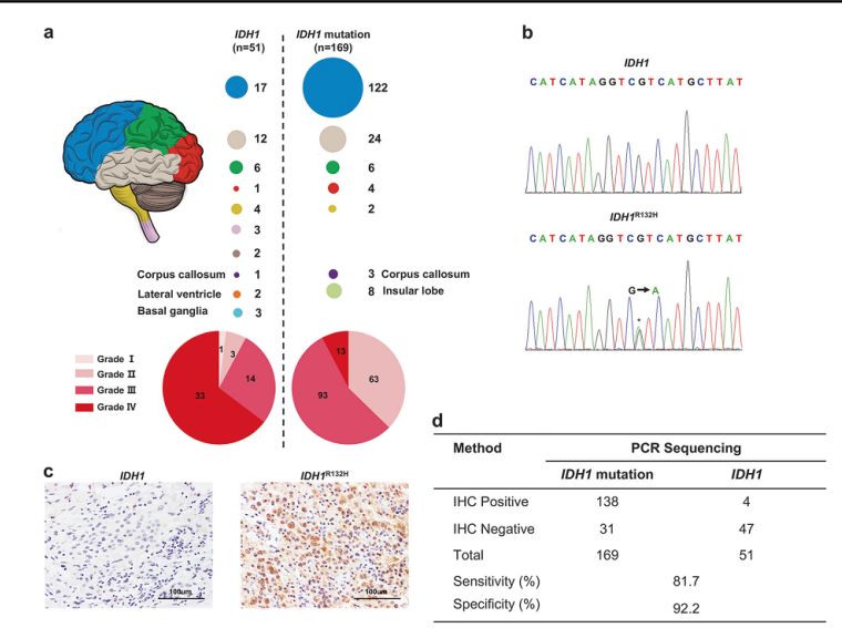 研究者首先在220例胶质瘤样本中检测IDH1突变状况。虽然,所采用PCR测序和免疫组化法具有较高的敏感性和特异性,但需要耗费1-2天的时间,无法快速诊断(图1)。