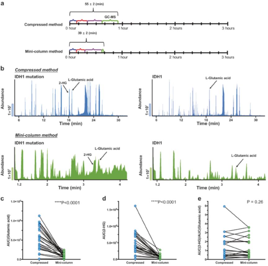 传统PCR测序和免疫组化法均需要1天以上的时间得到检测结果,不适合快速诊断。因此,作者在既往发现的基础上,提出应用GC-MS法对2-HG进行快速检测。