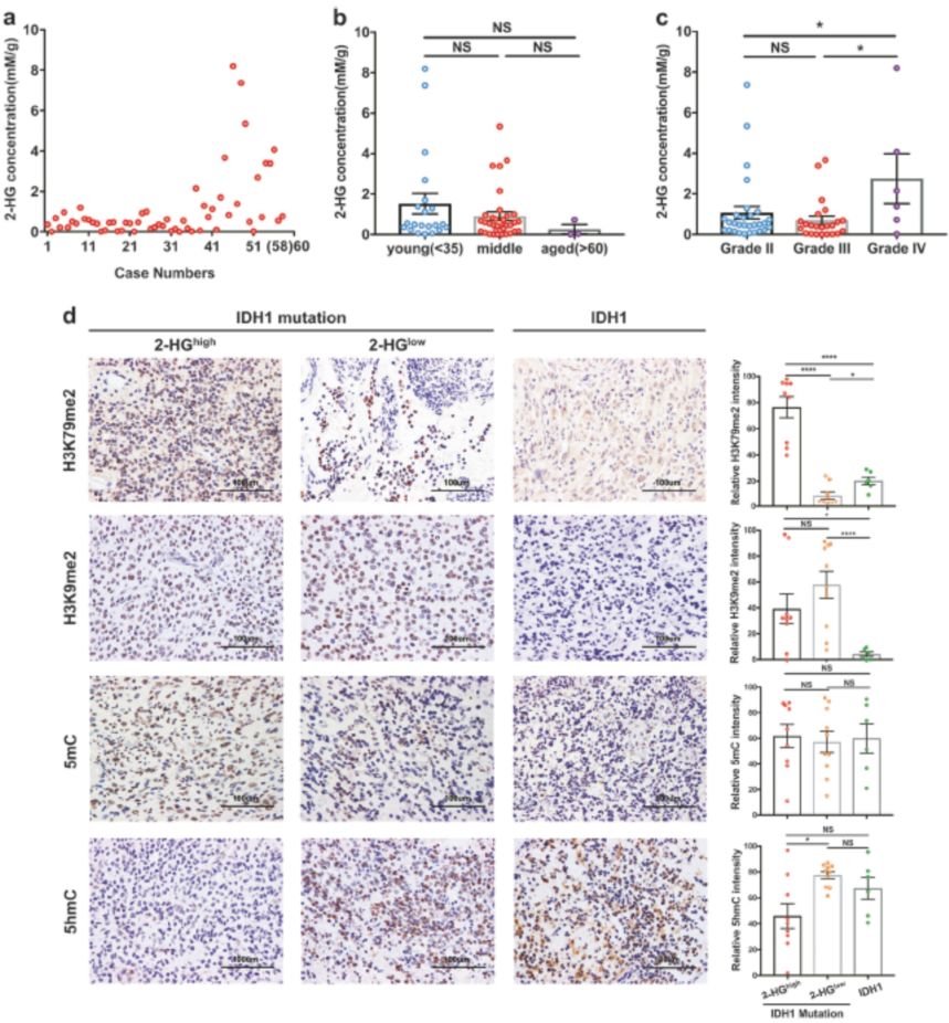 随后,作者对测序鉴定过的58例IDH1突变胶质瘤进行GC-MS检测,发现其中49例(84.5%)的2-HG含量低于2mM/g。2-HG的含量在GBM中显著高于低级别的胶质瘤。与野生型IDH1肿瘤相比,2-HG水平高于2mM/g时,6例IDH1突变肿瘤中H3K79二甲基化显著升高(P<0.0001);9例5-甲基胞嘧啶(5hmC)的平均相对强度在高于2-HGIDH1突变组、10例低于2-HG的IDH1突变组与6例IDH1野生型组之间没有明显差异(图2)。
