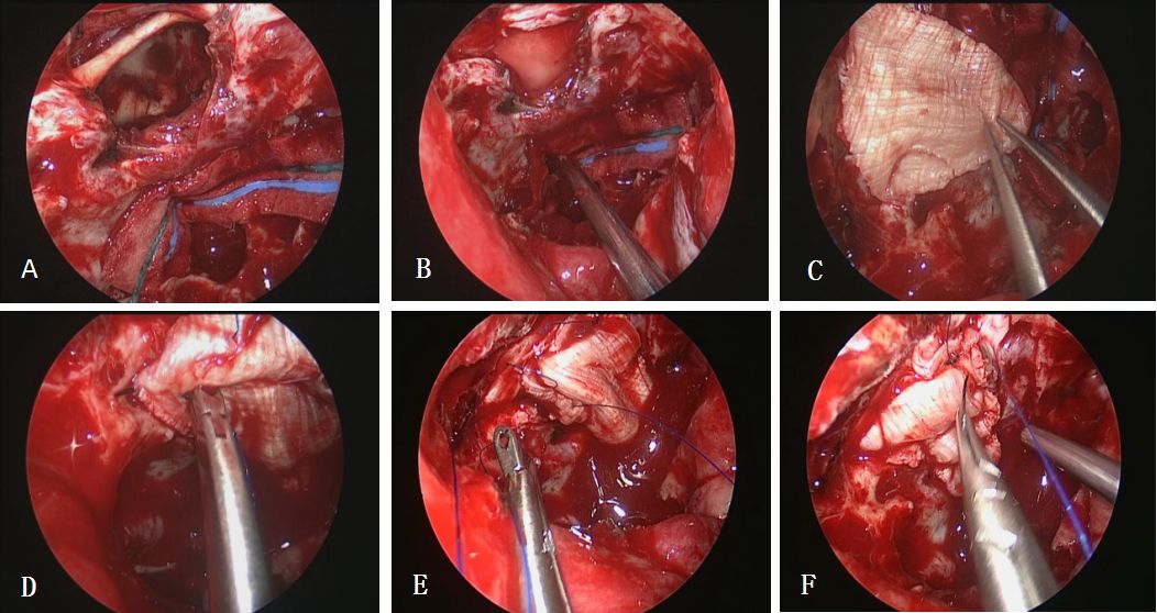 图1. A:肿瘤切除后鞍结节及蝶骨平台颅底硬膜缺损;B:天意福人工硬膜置入硬膜下作为第一层修补材料;C:裁剪合适大小的自体阔筋膜;D:单手缝合右侧颈内动脉远环附近硬膜缘;E:沿缺损硬膜缘逆时针方向连续缝合;F:助手持吸引器配合保障术野清晰,术者单手缝合左侧远环附近硬膜缘。