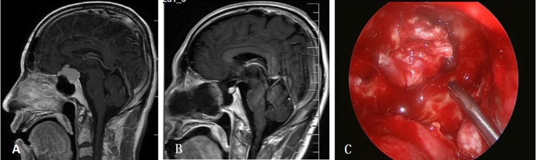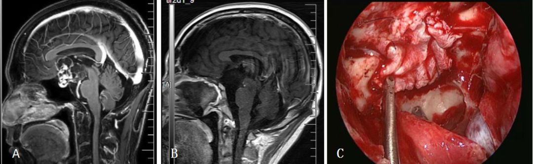 图4. A:鞍结节脑膜瘤术前矢状位MRI;B:鞍结节脑膜瘤术后矢状位MRI;C:自体阔筋膜连续缝合修补颅底硬膜。