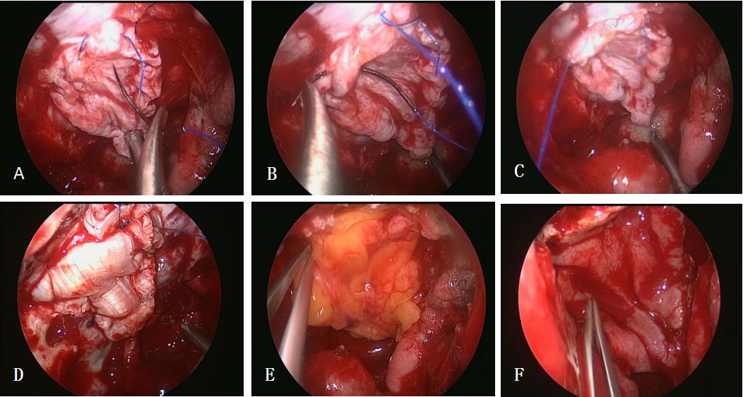 图2. A、B、C:连续缝合蝶骨平台硬膜缘;D: 自体阔筋膜连续缝合作为第二层修补材料; E: 自体脂肪片贴敷作为第三层修补材料;F: 带蒂鼻中隔粘膜瓣贴敷作为第四层颅底重建材料。