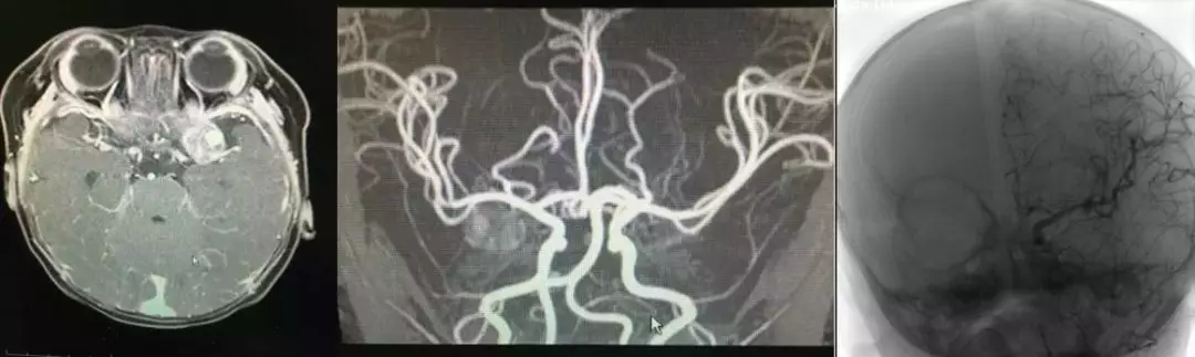 病理诊断:考虑动脉瘤并血栓形成及钙化。患儿于术后6月、12月再次来院随访复查。生长发育良好,无明显临床症状及神经功能障碍。先后两次复查头颅MRI+MRA未见明显新发异常改变。