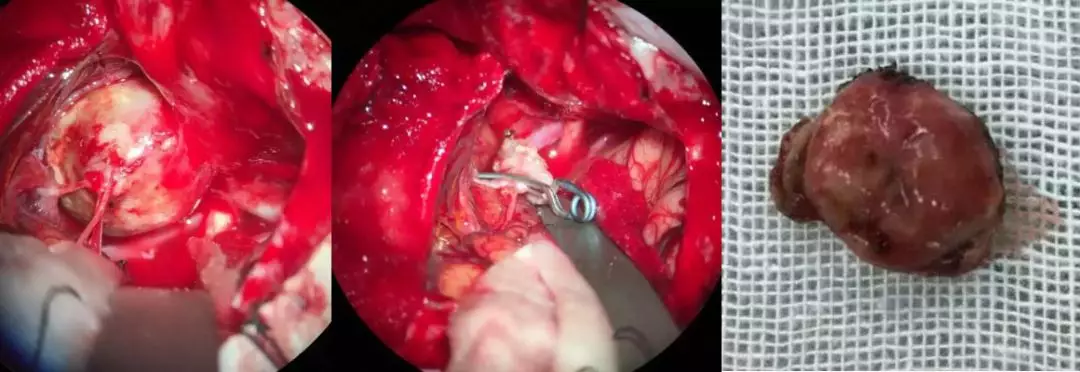 全麻满意后,患者仰卧位,取左侧翼点入路开颅。弧形切开硬膜,显微镜下仔细操作。见脑组织稍膨隆,分离外侧裂,探查见大脑中动脉M2段一巨大球形动脉瘤,直径约2cm,与周围组织粘连紧密,仔细分离粘连,切开瘤体,见瘤腔内形成血栓,清除瘤腔内血栓,切除部分动脉瘤壁,用Mini动脉瘤夹夹闭瘤颈,确认载瘤动脉通畅,用棉纤维包绕残端,手术顺利。