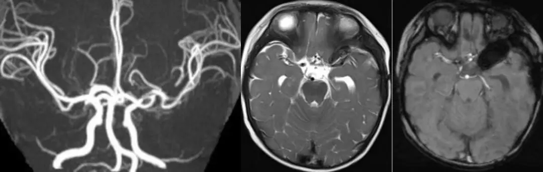 术后:术后患儿恢复可,生命体征平稳,一般情况可,术后一周出院。术后复查头颅MRI+MRA示原左侧大脑中动脉动脉瘤已未见显示,左侧额颞顶叶脑水肿,左侧额颞部少量硬膜下出血和蛛网膜下腔出血,颅内少量积气。