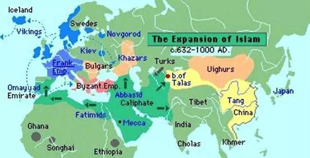伊斯兰人则称中世纪为 “伊斯兰黄金时代 - Islamic Golden Age”,阿拉伯帝国从西班牙经北非向东(上图,绿色),经过中亚细亚直达古中国唐朝(618-907,上图,黄色)的西部,被称为大食国。