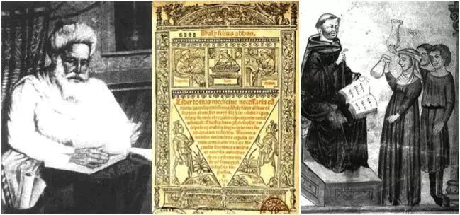 在皇家医书中 Abbas(上图左: Abbas,上图中: 皇家医书,上图右: 皇家医书翻译者 Constantinus Africanus 在培训医生用尿液做诊断)反复讨论了卒中和癫痫,认为两者是同宗同源,病因都是 “四行学说 - Four Humors(痰,血,黑胆汁和黄胆汁为四行,分别为水,气,土,火,他们的失衡引起疾病为 “四行学说“,下图)” 中的冷因素 “痰” 堵塞脑室所成。