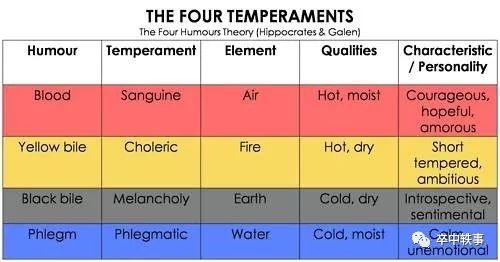 在当时 Galen 的卒中理论统领世界,Galen 认为卒中是 “四行学说 - Four Humours(上图)” 中湿冷两个因素的 “痰 - Phlegm” 充盈脑室,阻断了元气下达四肢,造成感觉运动障碍。