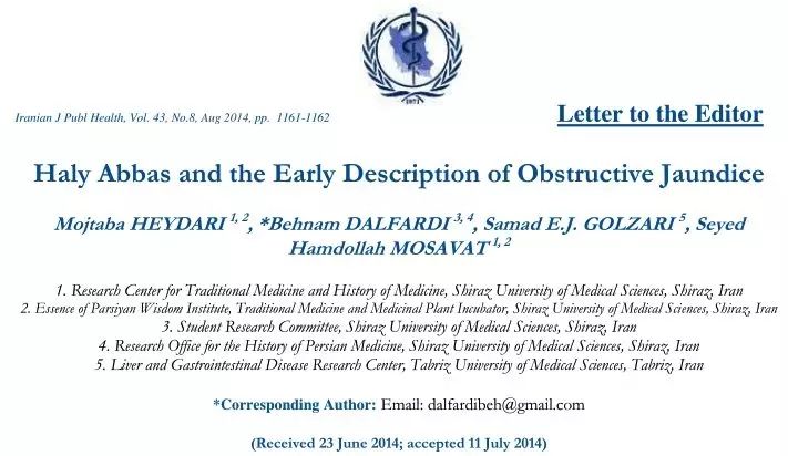 在皇家医书有关 “胆囊疾病,病因和表现 - On the Conditions Affecting Gallbladder, Their Causes and Manifestations” 的一章,Abbas 写到 “有时胆管受堵,胆汁淤积返流入肝,随血流进入全身 - Sometimes the Obstruction Occurs within the Ducts Connecting the Gallbladder to the Bowel, therefore, the Bile Amount increases and flows back toward the Liver, and Distributes through the Blood in the Body…”。