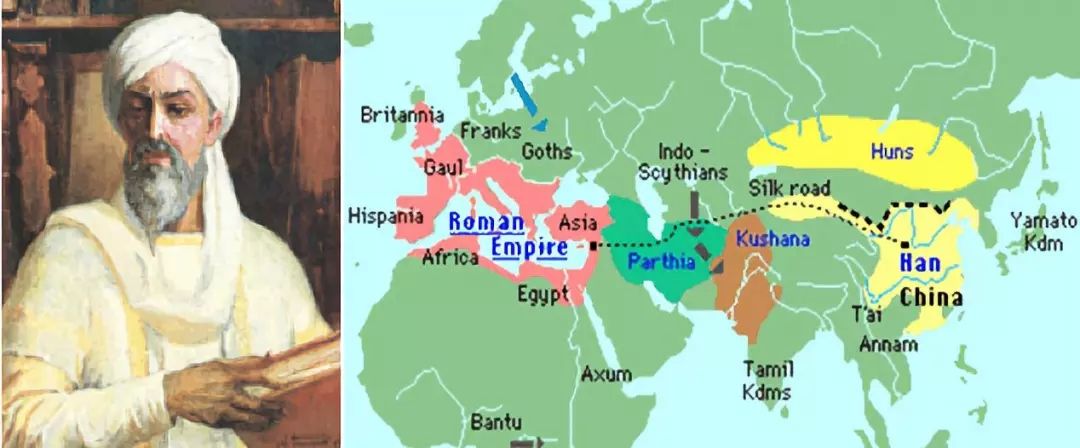 Abbas(上图左)出生在 “波斯 - Persia”(现为伊朗,上图右,粉色是古罗马帝国,绿色是波斯/伊朗,黄色下是古中国汉朝,黄色上为匈奴)西南的 Arejan,从师伊朗医生 Abu Maher Shirazi。