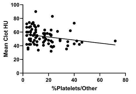 图5. NCCT上血小板/其他成分百分比与HU值之间的相关性。观察到血小板百分比与NCCT上的平均HU值呈显著的负相关(ρ=-0.243,p=0.025*,n=85)。