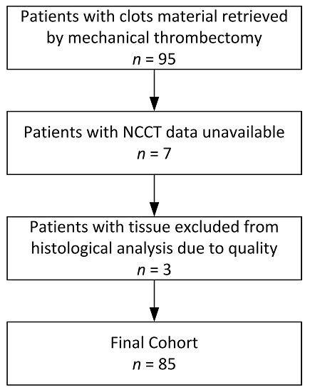 如果患者年龄大于18岁,接受了AIS的机械血栓切除术治疗,并在血管内治疗前进行了NCCT检查,则纳入本研究。单用rt-pa治疗的患者、血管内治疗前未行NCCT的患者以及数据不完整的患者被排除在研究之外(见图1)。使用MSB染色法对收集的血栓进行组织病理学分析,利用轨道图像分析(www.orbit.bio)对血栓的成分进行定量分析。在取栓之前,每个病人都进行了NCCT检查,并测量了每个血栓的CT密度。血栓和临床信息的相关性采用卡方检验进行分析。