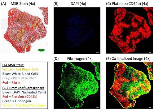 图3. 免疫荧光染色证实血栓中存在富血小板区。(A)一张MSB染色玻片的低倍放大图像(4x),显示血栓中存在纤维蛋白链(红色)、红细胞(黄色)、白细胞(蓝色)和血小板(灰色)。(B-D)免疫荧光图像显示(B)有核细胞(DAPI,蓝色)、(C)血小板(CD42b,红色)和(D)纤维蛋白原(绿色)。(E)一个合并的免疫荧光图像,显示血小板与纤维蛋白原(黄色)共定位。