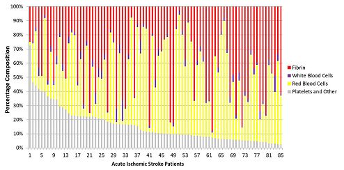 图4. 患者的血块血栓成分。这是由MSB染色确定的队列中每个患者的组织学血栓成分的图形表示,代表红细胞(黄色)、白细胞(蓝色)、纤维蛋白链(红色)和血小板(灰色)的百分比。