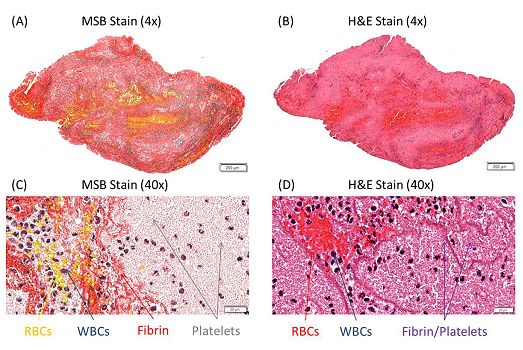 图2. MSB和HE染色血栓的比较。(A)和(C)是MSB染色玻片,显示存在红细胞(黄色)、白细胞(蓝色)、纤维蛋白链(红色)和血小板(灰色,用黑色箭头标识)。(B)和(D)是HE染色的玻片,从同一个血栓上取下的,显示有红细胞(红色)、白细胞(蓝色)和纤维蛋白/血小板(紫色)。