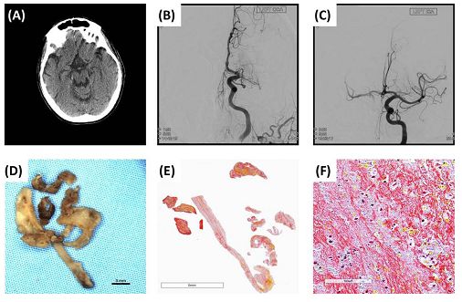 图6. NCCT上等密度的富血小板血栓示例。(A)机械取栓术前患者的NCCT图像。左颈内动脉(ICA)终末和大脑中动脉(MCA)M1支未见高密度动脉征。(B)机械取栓术前患者的数字减影血管造影(DSA)图像,显示ICA终端和MCA闭塞。(C)机械取栓后完全血运重建(TICI3)的DSA图像。(D)甲醛固定后的血栓照片。(E和F)血栓MSB染色载玻片的低(0.5x)和高(40x)放大图像,显示血栓内存在富血小板区(34.6%血小板,灰色)。