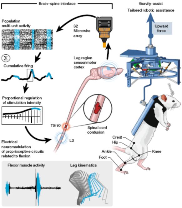 脊髓损伤导致大脑发送运动指令到达肢体的联络通路阻断,造成严重的运动障碍。患者在康复期,自身脑控调节比连续脊髓电刺激更具有促使运动功能恢复的作用;因此,建立脊髓神经环路可能有良好的应用前景。瑞士生物工程学院神经修复中心和生物工程研究所的Marco Bonizzato 等在动物脊髓损伤模型上开展相关研究,结果发表于2018年8月的《N ature C ommunications 》 在线。