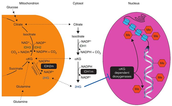 图1. 细胞处于稳态时IDH的功能以及IDH突变所引起的异常改变,尤其在细胞代谢方面。2HG,D-2-羟基戊二酸;αKG,α-酮戊二酸;IDH,异柠檬酸脱氢酶;IDHm,IDH突变体。