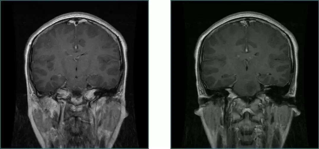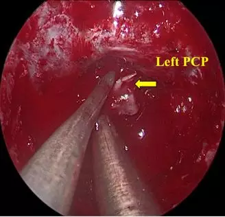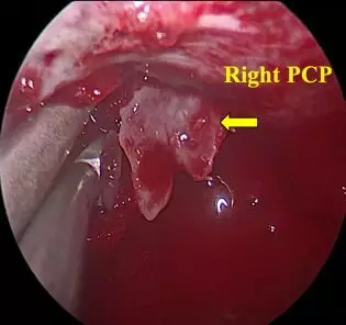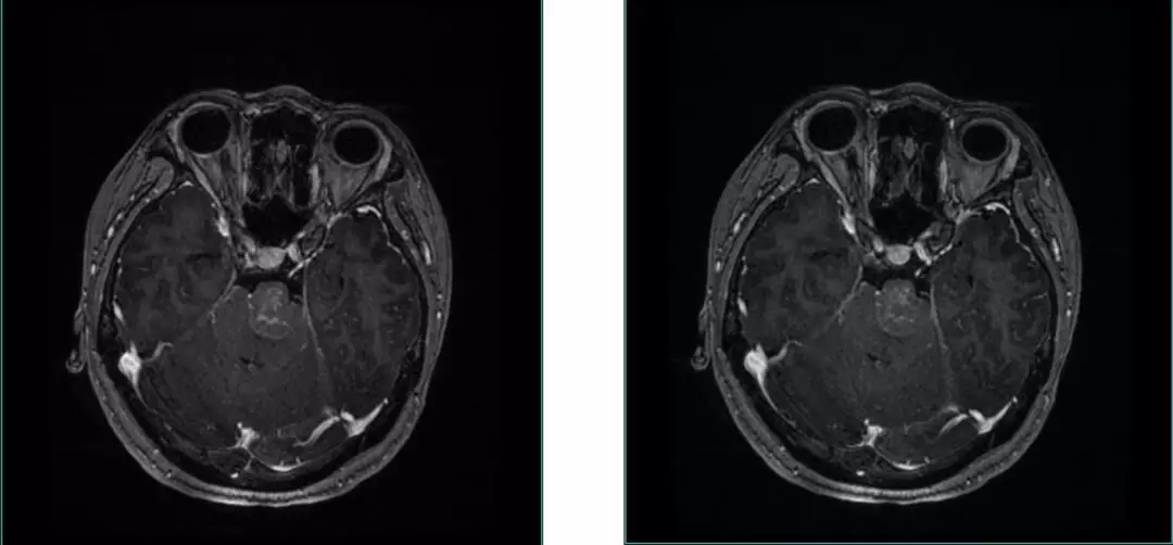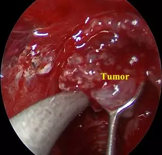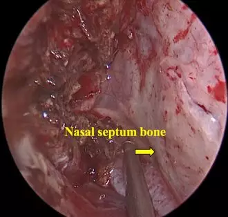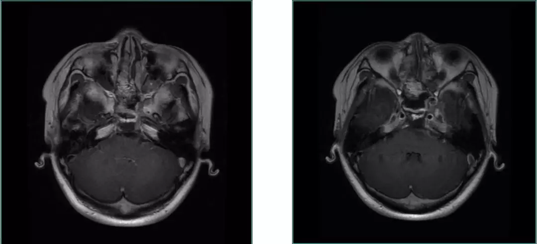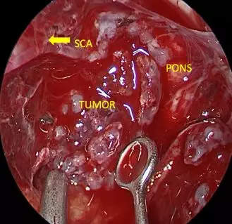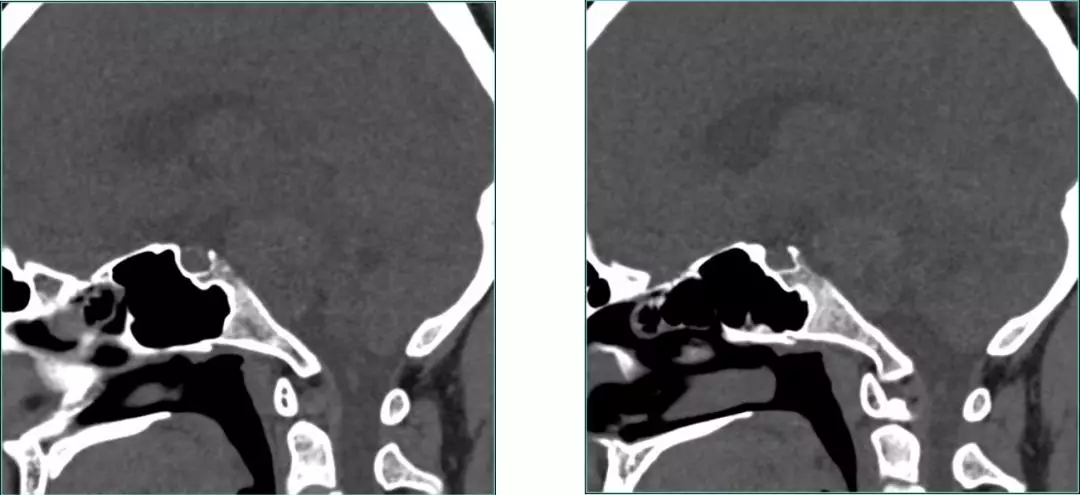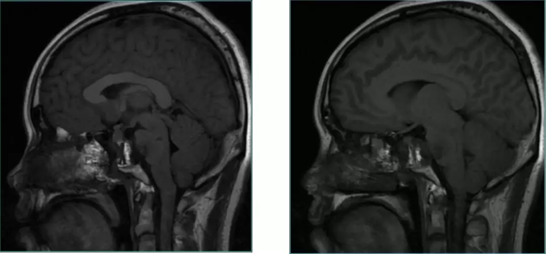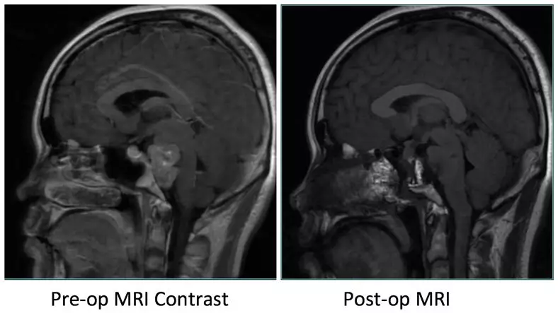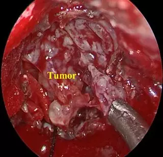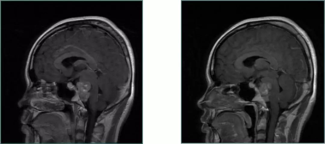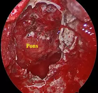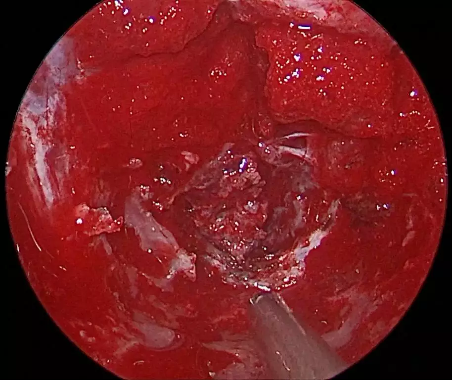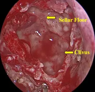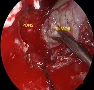 2. Endoscopic Transnasal approach: Invaded clivus bone can be removed easily, tumor embedding into brainstem can be removed directly and safely, damaging to brainstem tissue reduced maximally.