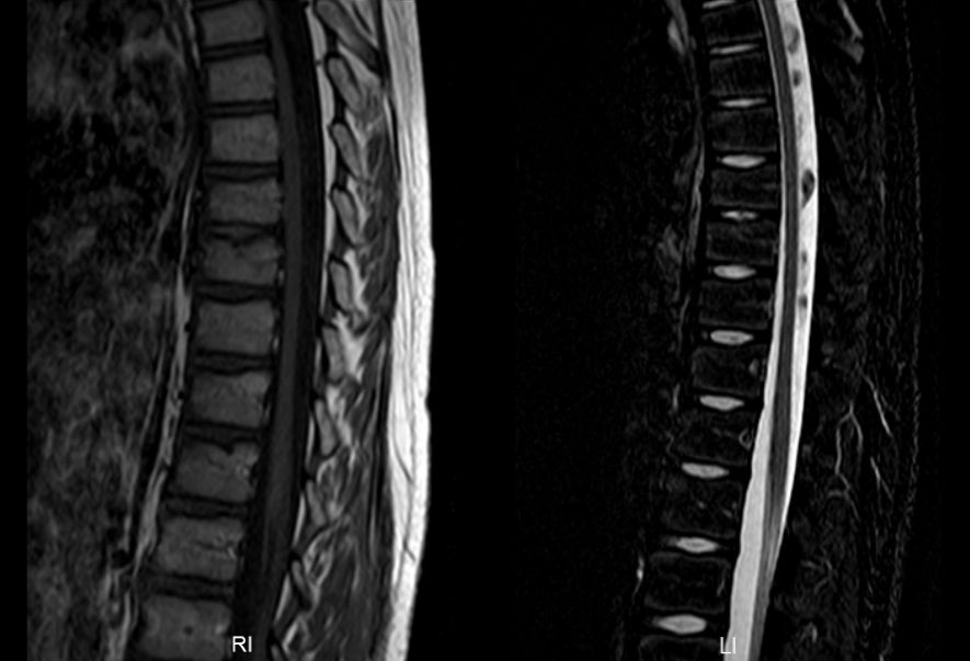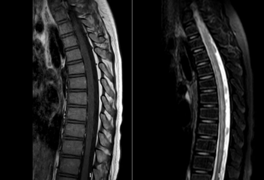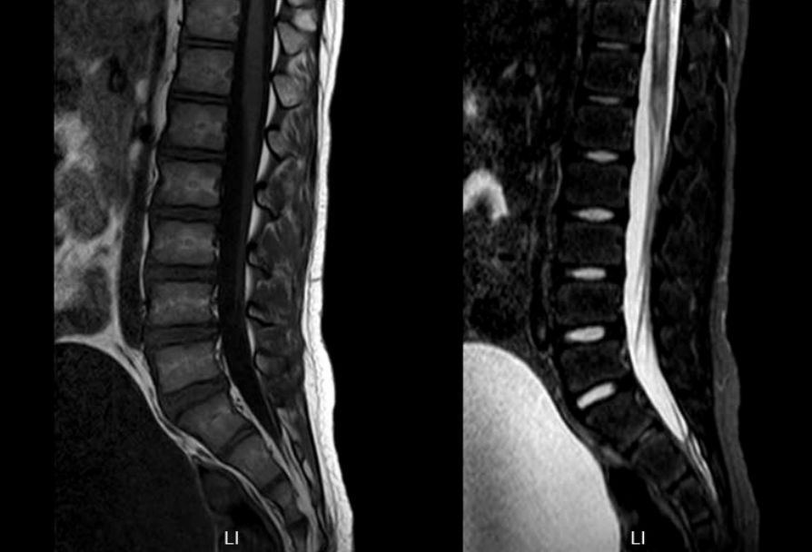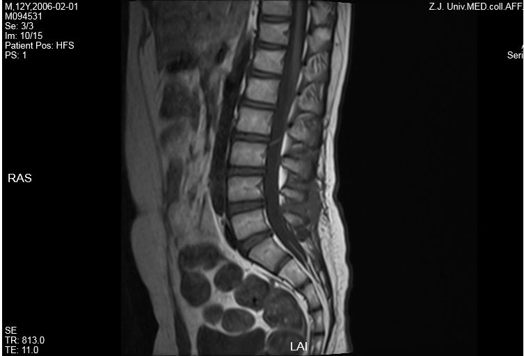 患儿1年半余前无明显诱因下晨起出现腰背部疼痛,以腰椎偏右侧持续性疼痛为主,后逐渐蔓延至四肢,并出现行走受限伴小便失禁,尿色清,尿量可,入住浙江大学医学院附属儿童医院神经内科。