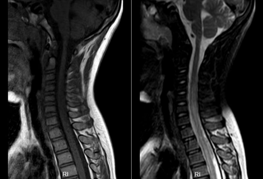 图1. 第一次住院头颅及脊髓MRI,显示左侧小脑半球异常信号。脊髓全段肿胀,伴信号异常,腰骶髓异常信号影,考虑脊髓炎可能。
