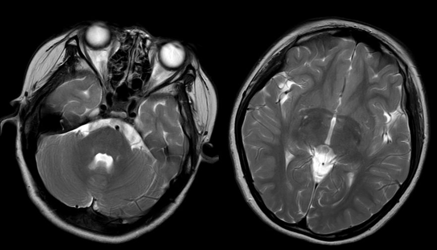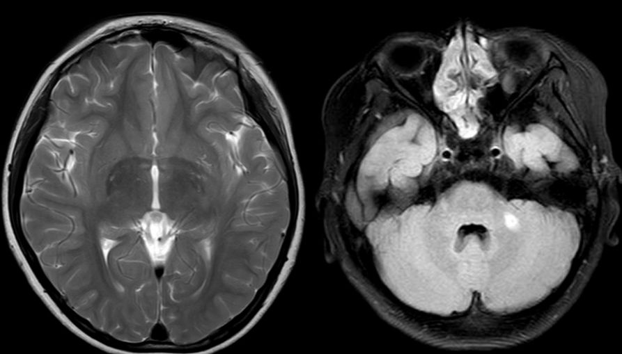 图2. 治疗1年后复查头颅及全脊髓磁共振:左侧小脑半球与前片比较异常信号基本消失。全脊髓粗细正常,未见明显异常信号。