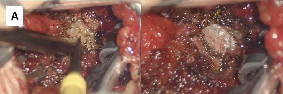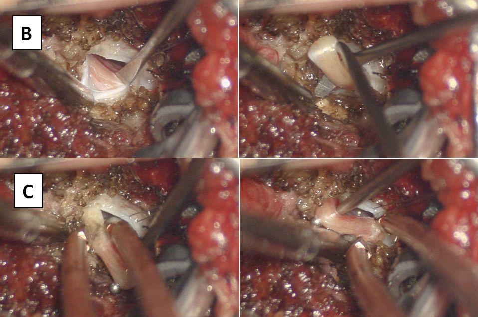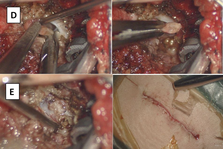 图5. A切开棘上韧带至黄韧带,暴露硬脊膜,B再切开硬脊膜探查椎管内:C明确脂肪变的终丝,游离周围神经,D电凝终丝血管,切断终丝。E缝合硬膜及切口