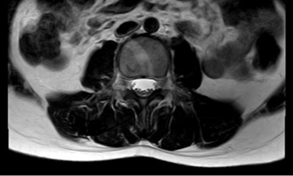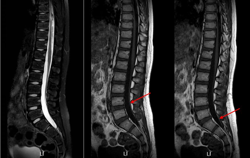 请放射科等多学科MDT讨论后认为:脊髓圆锥末端位于L1下缘水平,腰膨大形态较僵,终丝处于绷紧状态,位置偏后,横断面T2上终丝信号偏低,脂肪浸润可能,需考虑脊髓栓系综合征。