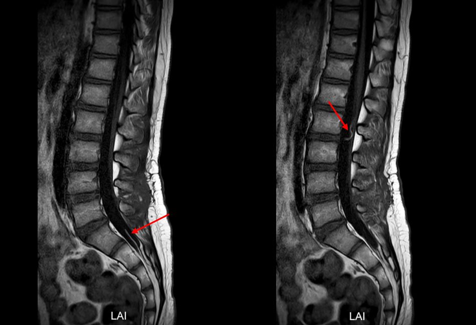 图3. 腰骶髓MR:箭头所指处可见终丝脂肪信号,T1上高信号,T2上低信号。
