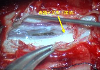 在硬脊膜分隔两侧梭形切开硬膜,显露出左右侧脊髓。