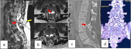 MRI检查矢状位(图a)可见椎腰3、4水平椎管内横行骨棘(红色箭头处),脊髓内局部异常信号,横断位(图b)可见脊髓分为左右两支,脊髓位于左右两支脊髓之间。另可见患者背部皮毛窦、终丝增粗、双棘突畸形。CT(图c)可见腰3、4椎体分节不全,部分融合,骨棘为高密度,考虑为骨性。棘突形态欠规则。CT三维重建(图d)可更直观反映双棘突及骶椎裂的情况。