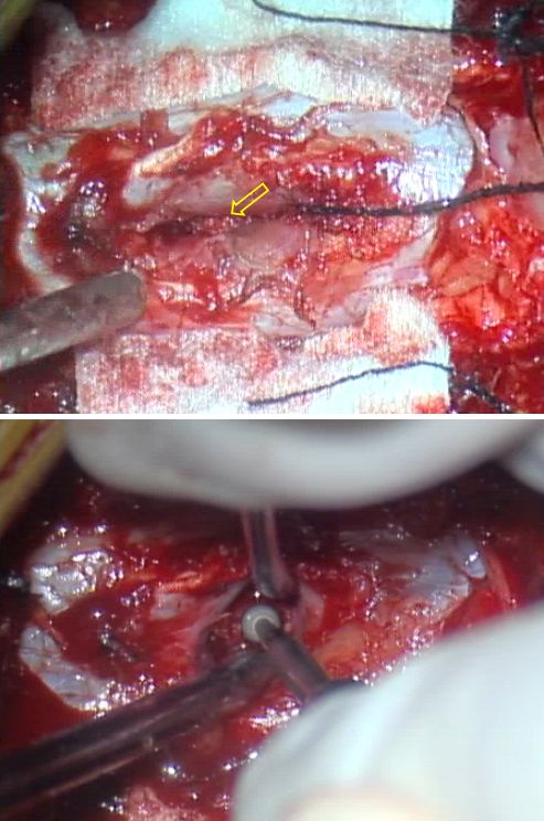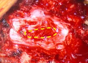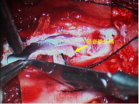 骨棘处理完成后,可显露出两侧硬膜囊中间的硬脊膜分隔,如图中黄色箭头所示。