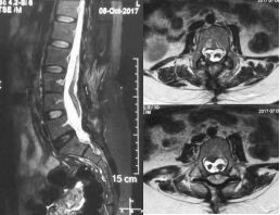 患者王某某,33岁女性,以“腰痛9年,加重伴二便障碍、右下肢肌力减退15天入院”,患者腰部酸痛9年,当地医院行“腰麻”下剖宫产术后腰痛症状突然加重,并伴有严重排尿困难,大便费力,右下肢肌力减退,入院时右下肢肌力II级。