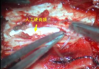 缝合硬脊膜切口,将两侧硬膜囊合为一个,脊髓与背侧硬脊膜切口之间可用不可吸收人工硬脊膜隔开,防止脊髓与硬膜切口粘连。