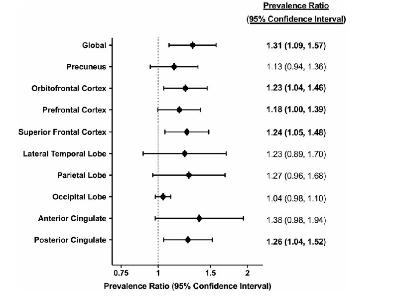 参与者平均年龄为76岁,57%女性,43%黑色人种,25%有头部受伤史。头部受伤与全脑(PR=1.31;95% CI,1.19-1.57),以及眶额皮质(PR=1.23;95% CI,1.04-1.46)、前额皮质(PR=1.18;95% CI,1.00-1.39)、额上回皮质(PR=1.24;95% CI,1.05-1.48)、和后扣带回皮质(PR=1.26;95% CI,1.04-1.52)的SUVR>1.2的发生率升高有关(图1)。