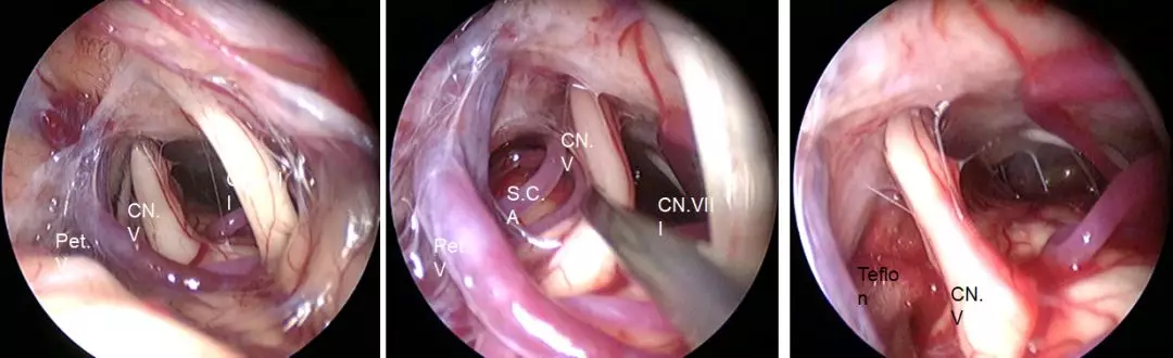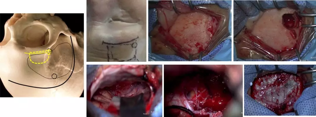 乙状窦后入路的锁孔手术主要应用于一些神经功能性疾病以及下丘脑角肿瘤,可以清晰地看到面庭神经、三叉神经、血管等。采用乙状窦后入路解决三叉神经痛和面肌痉挛时,手术切口又有所不同,三叉神经痛切口稍偏上,而面肌痉挛的切口可以稍偏下一些,这样更容易从神经和血管的间隙达到手术的目的地。