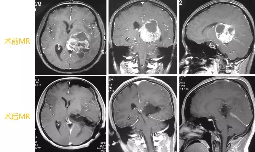 切除以后,脑组织坍陷,肿瘤切除较充分。