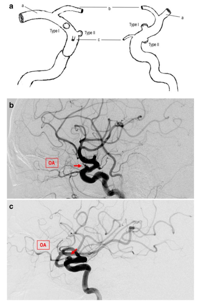 图3. 依据BBA与眼动脉(OA)起始部关系分型示意图。a.Ⅰ型:动脉瘤位于OA起始部远端;Ⅱ型:动脉瘤位于OA起始部周围血管壁;b.DSA造影显示Ⅰ型 BBA(箭头);c.DSA造影显示Ⅱ型BBA(箭头)。