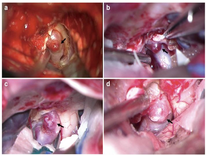 图1. 依据术中观察诊断BBA和非BBA。a、b.根据极其脆弱的动脉瘤壁诊断为BBA;c、d.动脉壁相对较厚和牢固诊断为非BBA。