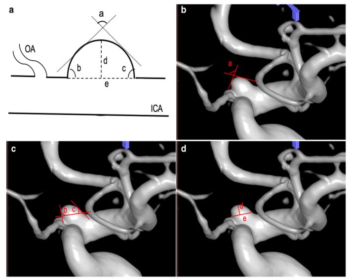 图2. 测量DSA造影片上动脉瘤几个参数。a图.测量示意图:a(顶角)为与动脉瘤壁隆起相切的两条直线之间的交角;b(近端角)和c(远端角)各为动脉瘤壁隆起与基底线的交角,以离眼动脉近或远命名;d(瘤体垂直径)为动脉瘤壁穹隆顶至基底线的垂直距离;e(瘤颈)为动脉瘤基底线的长度。b-d图分别为在DSA上测量的顶角、近端角的远端角大小以及瘤体垂直径和瘤颈的长度。(OA,眼动脉;ICA,颈内动脉)