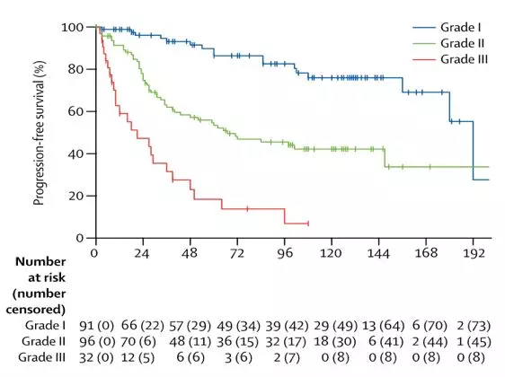 理论上大部分的脑膜瘤都是良性的,手术切除后将不会复发和进展,然而在实际的临床治疗中,我们发现仍有一部分被诊断为WHO I和WHO II的患者手术治疗后疾病进展和复发。这说明了仅依赖于传统的WHO组织分型很难准确的区分哪些患者手术后会发生疾病进展和复发。因此发掘和鉴定用于预测脑膜瘤恶性复发的分子标志物显得尤为重要。