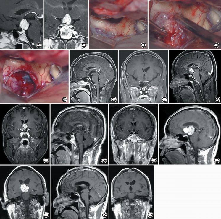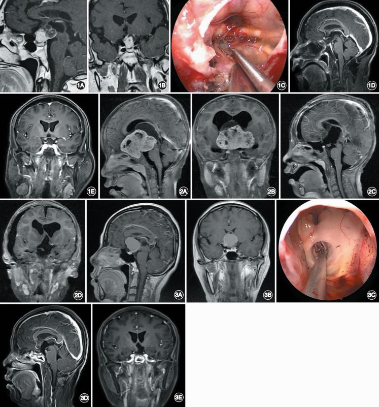 图1. 鞍内-鞍上型颅咽管瘤患者的影像学资料和术中所见。A,B.术前矢状位(A)和冠状位(B)增强 MRI显示肿瘤位于鞍内-鞍上区;C.神经内镜经鼻入路可直抵肿瘤腹侧,清晰可见鞍内、视交叉下方及肿瘤与下丘脑之间的区域,同时垂体和视交叉之间的空隙足以切除肿瘤;D,E.术后矢状位(D)和冠状位(E)增强 MRI可见肿瘤完全切除。图2. 向两侧生长过多的鞍内-鞍上型颅咽管瘤患者的影像学资料。A,B.术前矢状位(A)和冠状位(B)增强 MRI显示肿瘤位于鞍内-鞍上区,且向两侧生长过多;C,D.经额外侧入路切除肿瘤后,矢状位(C)和冠状位(D)增强 MRI显示肿瘤完全切除。图3. 鞍上型颅咽管瘤患者的影像学资料和术中所见。A,B.术前矢状位(A)和冠状位(B)增强 MRI显示肿瘤位于鞍上区;C.神经内镜经鼻入路可直抵肿瘤腹侧,肿瘤切除后可见第三脑室内脉络丛和中脑导水管上口;D,E.术后矢状位(D)和冠状位(E)增强 MRI显示肿瘤完全切除。