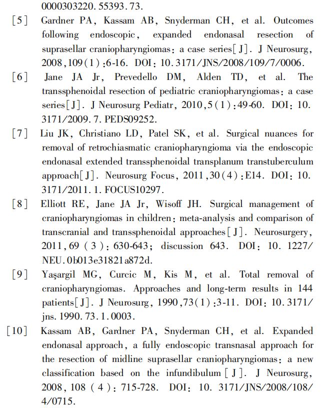 (6)原发颅咽管瘤的首次手术能否全切除非常重要,直接关系患者的生存时间和生命质量;