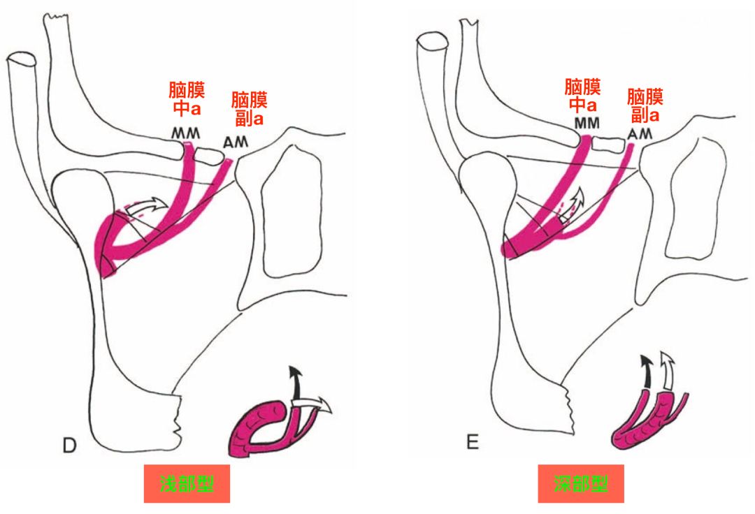Lasjaunias等(Lasjaunias 2001)介绍了一种在脑血管造影上区分浅部型和深部型的方法。在颈外动脉或上颌内动脉造影的正位片上,如果上颌内动脉走行方向的轮廓与脑膜中动脉是相反的,则为浅部型;如果上颌内动脉走行方向的轮廓与脑膜中动脉相同,则为深部型。