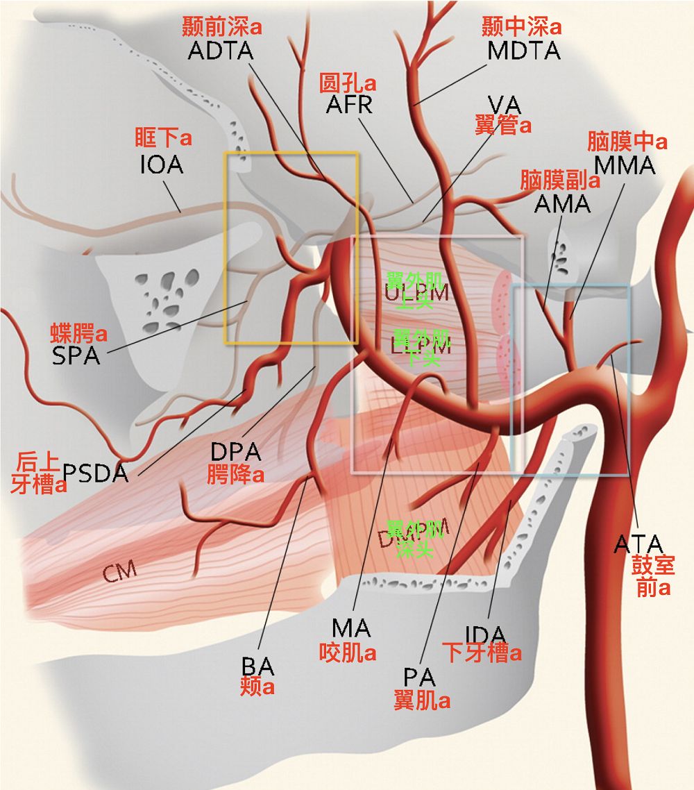 左侧位,显示上颌内动脉的分段,蓝色代表第一段(下颌段),粉色代表第二段(翼段),黄色代表第三段(翼腭段)(Dilenge 1980)。