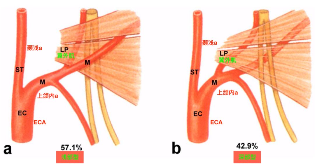 根据上颌内动脉的走行,特别是上颌内动脉的第二段(翼段)与翼外肌的关系,将上颌内动脉的走行分为浅部型(superficial type)和深部型(deep type)。