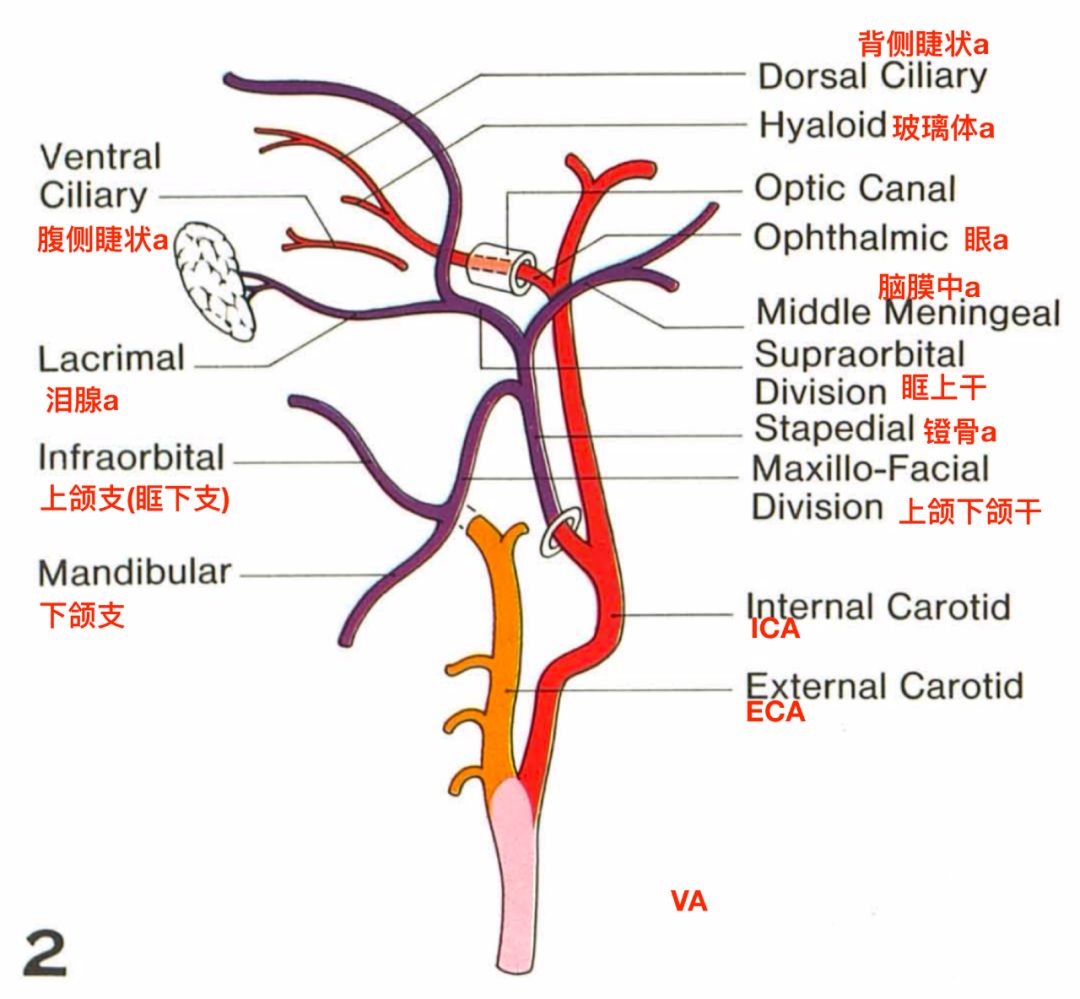 20mm胚胎期:镫骨动脉分支。上颌下颌干加入颈外动脉,形成从上颌内动脉发出的脑膜中动脉的主干。眶上干形成脑膜中动脉的颅内段,并发出分支进入眼眶,最后融入眼动脉,供应眼球外结构(Dilenge 1980)。