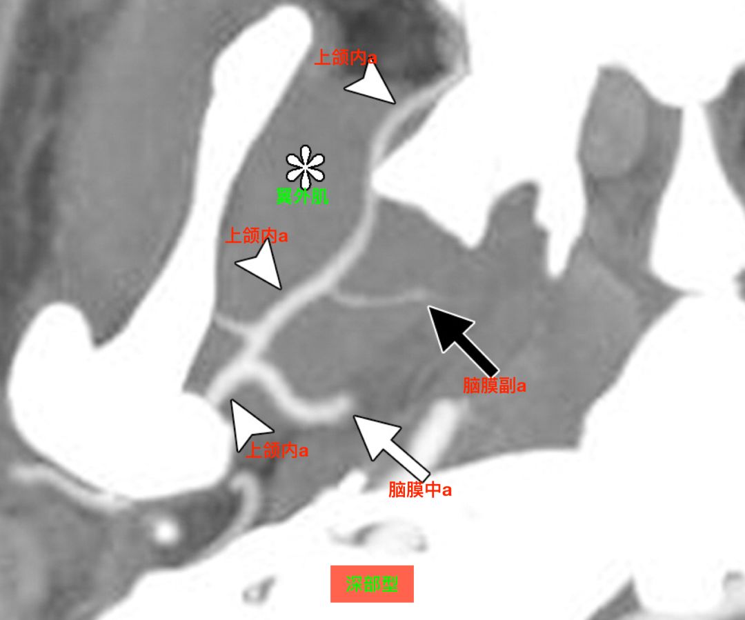 CTA,深部型,上颌内动脉走行于翼外肌深面,脑膜中动脉和脑膜副动脉分别发自上颌内动脉(Tanoue 2013)。